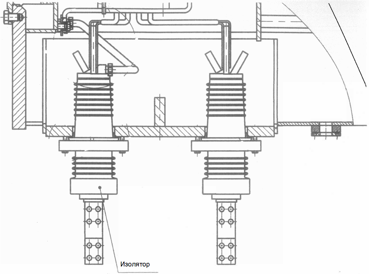 Проходной изолятор ИП-1219 предназначен для изолирования концевых выводов обмоток турбогенераторов от металлических конструкций корпуса статора при соединении их с нулевыми и линейными шинопроводами. Установка изолятора в коробке выводов изображена на рисунке: